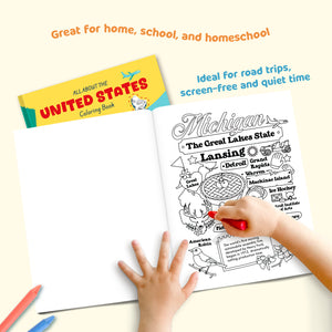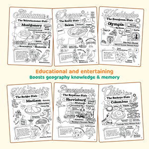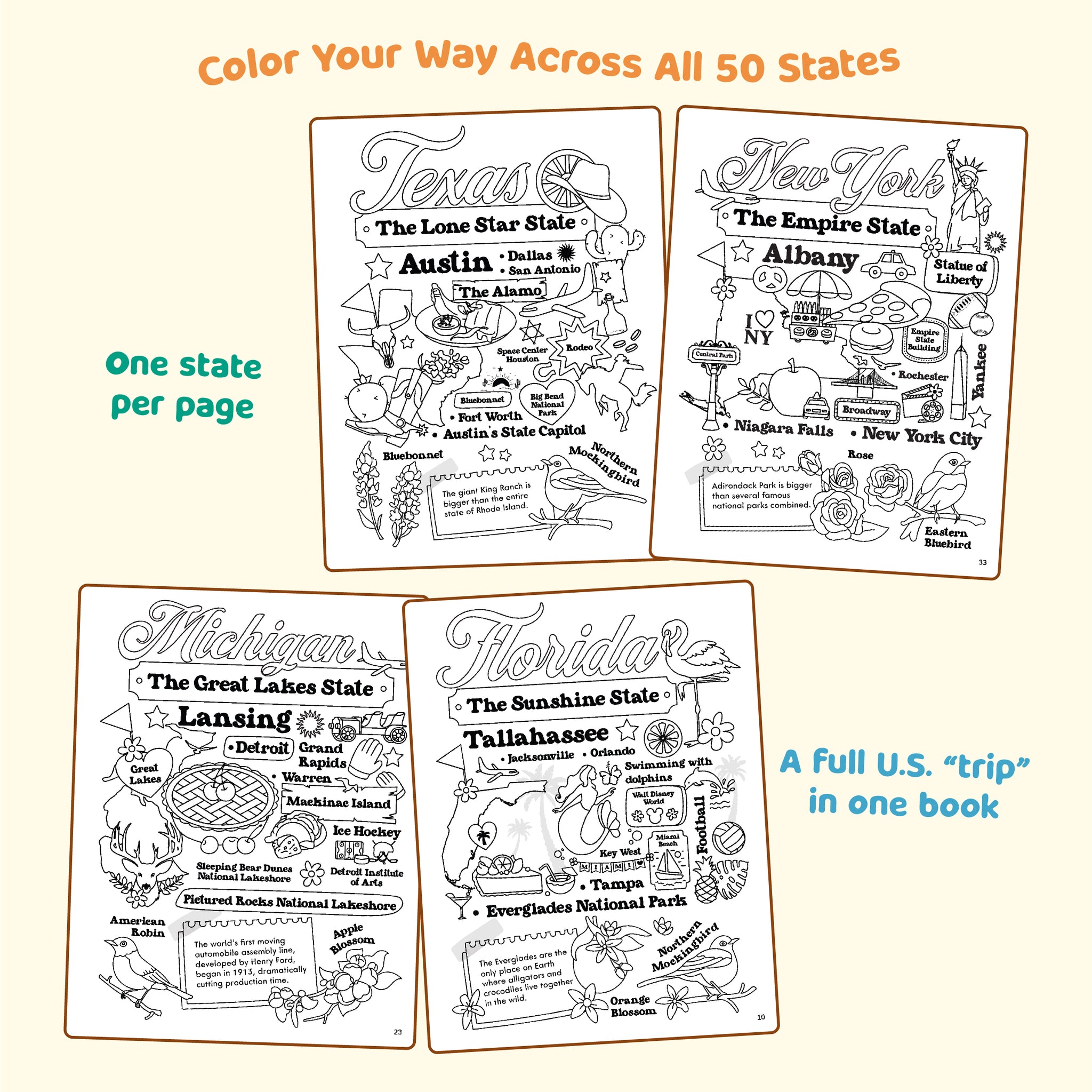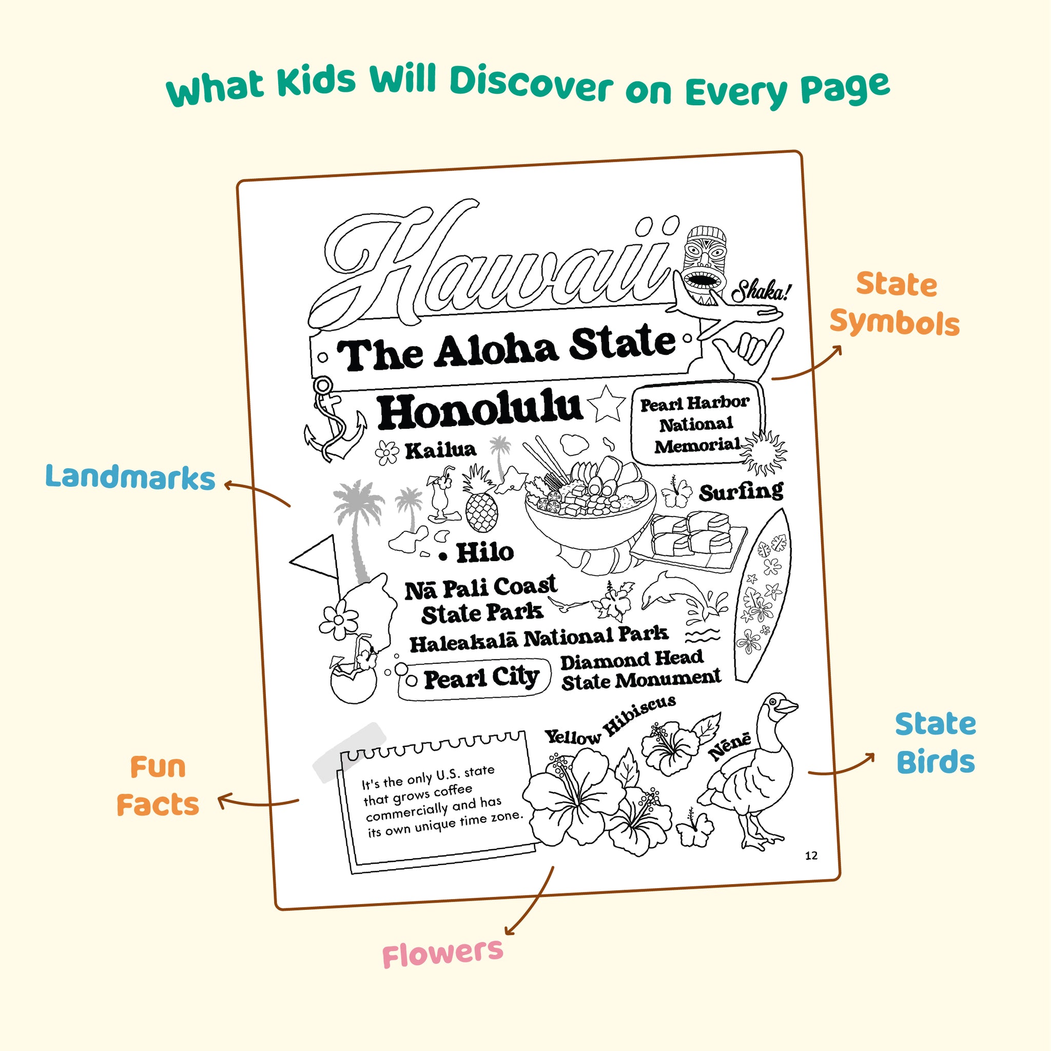 Encourages kids to explore, imagine, and take pride in discovering all 50 states, one coloring page at a time.