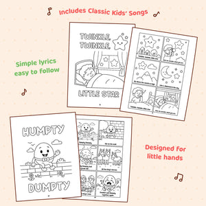 Kids color along to familiar nursery rhymes such as Twinkle Twinkle Little Star, Mary Had a Little Lamb, Humpty Dumpty, and more.